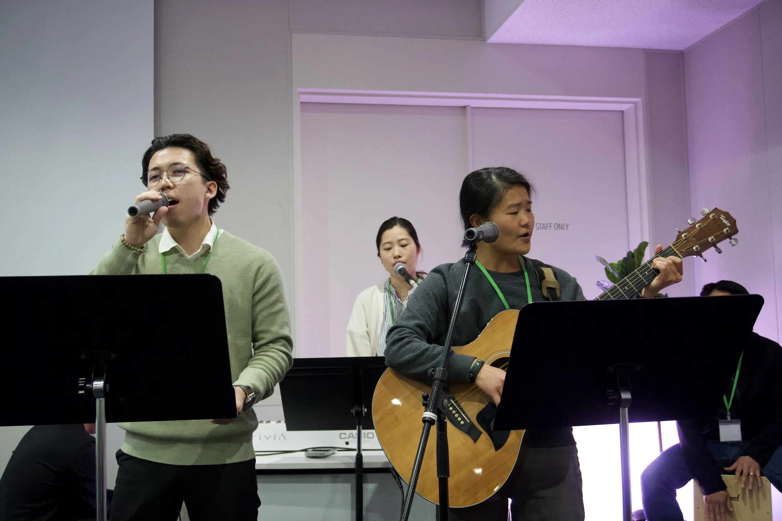 During the service, we worship God through music and singing. The style is modern, using instruments like guitar and piano, and we sing in both Japanese and English. Lyrics are displayed on the screen at the front, so everyone is welcome to sing along. If you're not a Christian, you're also welcome to simply listen and participate in whatever way you feel comfortable.